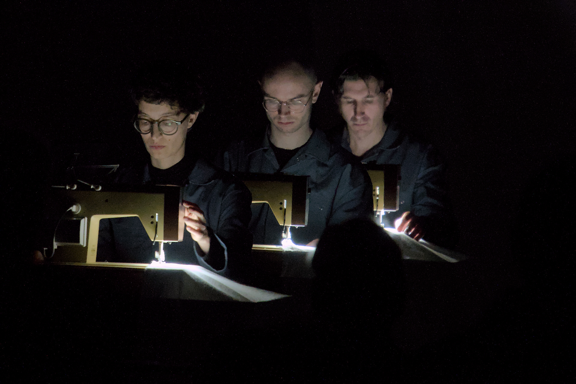 The performers move between sewing machines, walls, and instruments, and the light sculpts these elements into a confined, shifting architecture that constantly negotiates exposure and concealment, visibility and erasure.